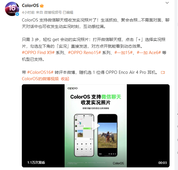 日前, @ColorOS 发布官宣视频,公布了ColorOS机型支持实况照片更多分享渠道的消息。据称,“ColorOS 支持微信聊天框收发实况照片了!生活抓拍、聚会合照…不需面对面,聊天对话中也可收发生动实况时刻,互动感拉满。只需 3 步,轻松 get 会动的实况照片:打开微信聊天框,点击「+」选择实况照片,勾选左下角的「实况」直接发送,对方点开就能看到动态效果。#OPPO Find X9# 系列、#OPPO Reno15# 系列、#一加15#、#一加 Ace6# 等机型已支持。”