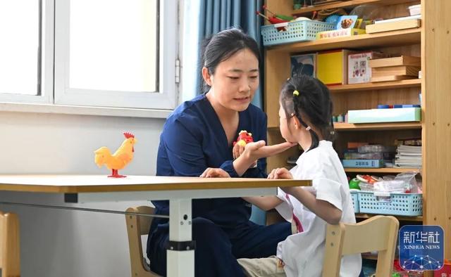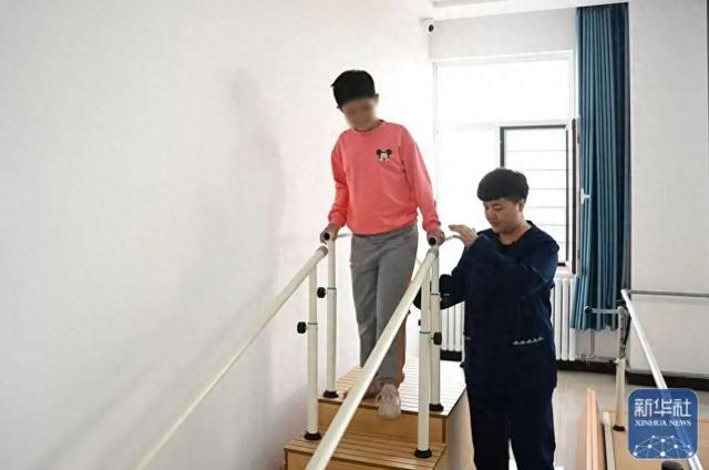 4月15日,在内蒙古鄂尔多斯市蒙医医院康复中心,康复师(左)为一名残疾儿童进行康复训练。新华社记者 贝赫 摄