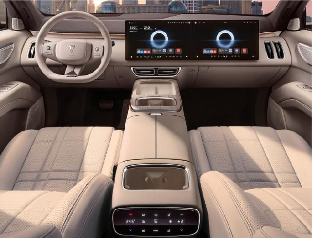 内饰配置:科技与舒适并存进入车内,深蓝 S09 给人的第一感觉就是科技感与舒适感十足。车内整体采用浅色搭配,营造出一种温馨、宽敞的氛围。中控台具有简约化设计风格,配备双 15.6 英寸悬浮式中控屏(2.5K 分辨率、1000 尼特亮度)和副驾屏,两块屏幕为连体布局,显示效果清晰,操作流畅,点击滑动毫无卡顿感,加载速度更是快如闪电。搭配显示效果达到 43 英寸的 AR - HUD 抬头显示系统以及鸿蒙座舱 HarmonySpace 5,为驾驶者带来了前所未有的科技体验。方向盘采用三辐式造型,设计有按键和滚轮组合的物理多功能控制方式,方便驾驶者操作,同时方向盘使用皮质拼接包裹,手感舒适。