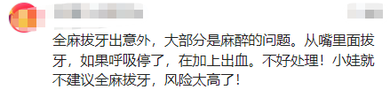 还有为网友认为,全麻拔牙出意外,大部分是麻醉的问题,从嘴里面拔牙,如果呼吸停了,再加上出血,不好处理!小娃就不建议全麻拔牙,风险太高了。