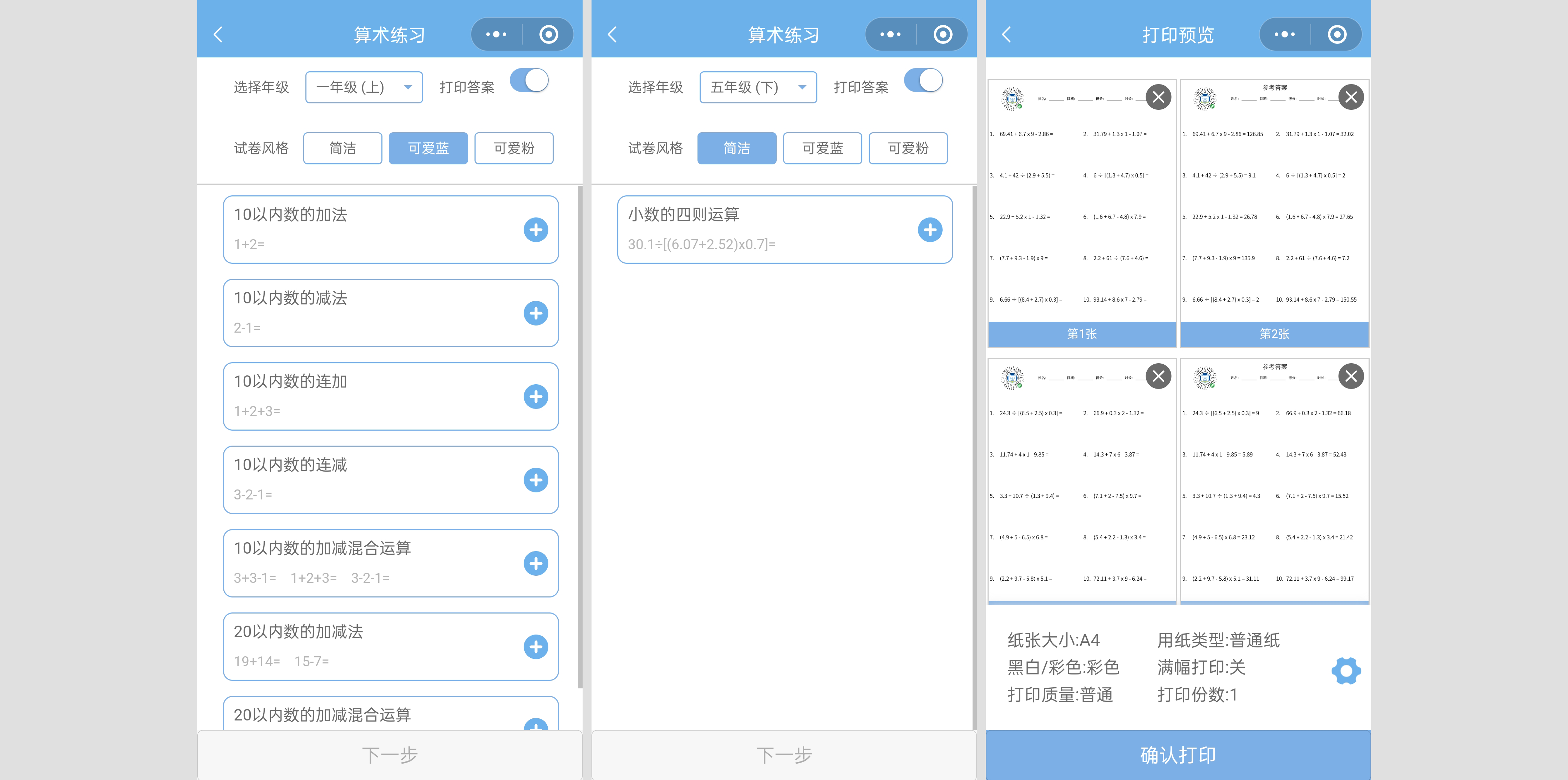 另外,我们还能够自主创建一年级至五年级的算术练习册,这一功能对于幼师和小学老师来说尤为实用,能够极大地丰富教学内容。