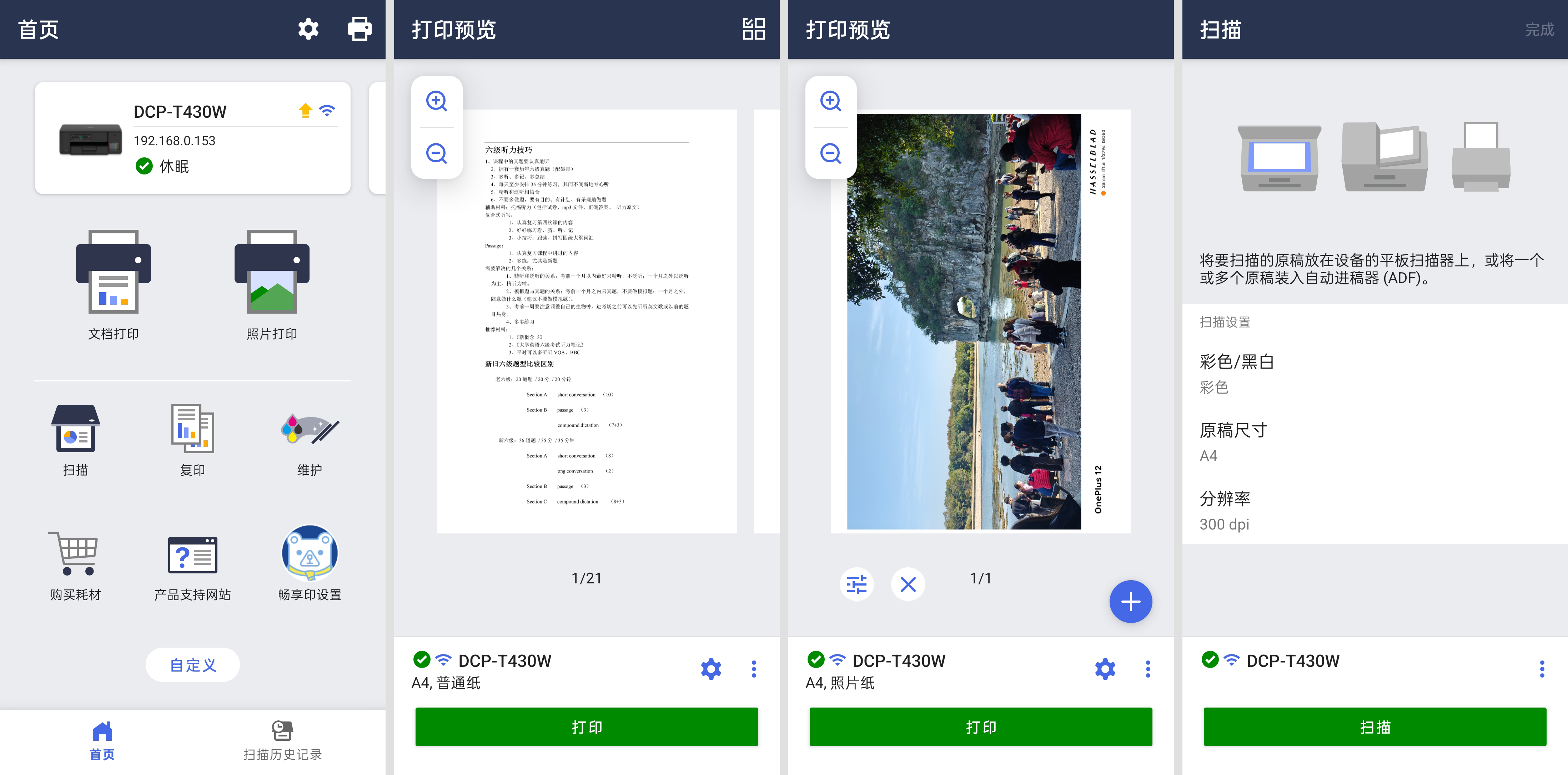 完成设置后,我们便可以使用Brother Mobile Connect打印手机内的文档和照片,也能通过扫描功能将资料保存至手机或分享给他人。不过,在使用过程中需要留意,使用Brother Mobile Connect进行扫描时,分辨率最高只能设置为300 dpi。并且无论是扫描还是打印操作,手机都必须与兄弟DCP-T430W处于同一网络环境下,否则将无法正常使用该APP的相关功能。