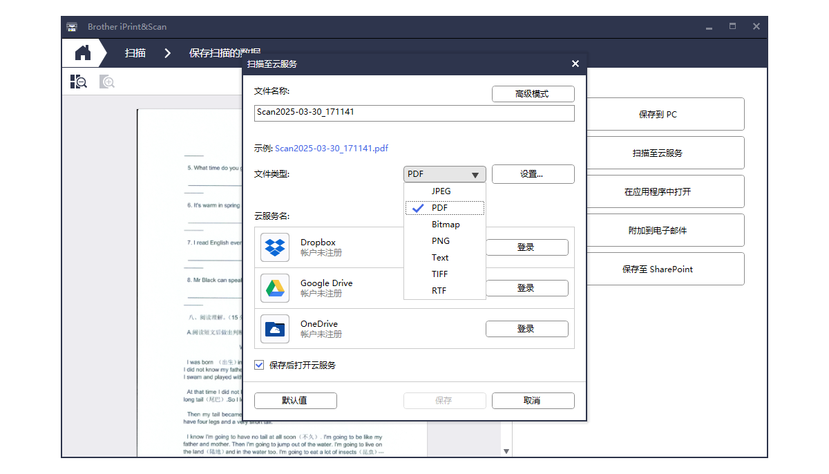 扫描完成后可以选择将文件保存在本地PC上,或者存放在Dropbox、Google Drive和OneDrive等云服务器上,以实现文件的云端存储和共享。同时,支持的文件类型也相当丰富,包括JPEG、PDF、PNG等在内的7种格式均得到支持。当然,还可以直接通过电子邮件的方式将其发送到指定邮箱中,实现文件的快速传输。