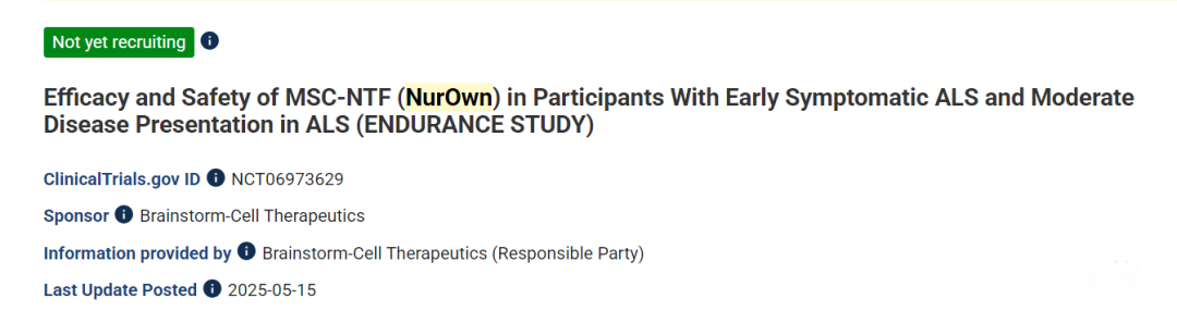 2025年5月20日,美国纽约细胞疗法科技公司BrainStorm Cell Therapeutics Inc. (NASDAQ:BCLI)宣布,美国食品药品监督管理局(FDA)已批准启动其创新疗法NurOwn®(自体 MSC-NTF 细胞)治疗肌萎缩侧索硬化症(ALS,又名渐冻症)的3b期临床试验。这一里程碑标志着该疗法在攻克这一致命神经退行性疾病领域迈出关键一步,为全球渐冻症患者带来新的治疗希望。