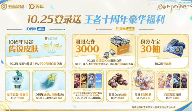 众所周知,王者荣耀此次十周年庆典中,已经公布了大量的活动福利。而这里面,最重要的就是周年庆当天,也就是25号登录游戏之后,玩家们能够领取一堆奖励。其中,3000限时点券,周年庆传说皮肤领取,积分夺宝30抽,青铜灵宝以及各种回城特效道具。另外,周年庆皮肤自选宝箱,还有50个蔷薇之心,艾琳新皮肤登录领取等等。不得不说,王者荣耀这次的福利,是前所未有的,而且比以前所有周年庆福利加起来,或许都没有这次这么多啊。当然了,在周年庆到来之前,孙权的新勇者皮肤也是上架了哦。