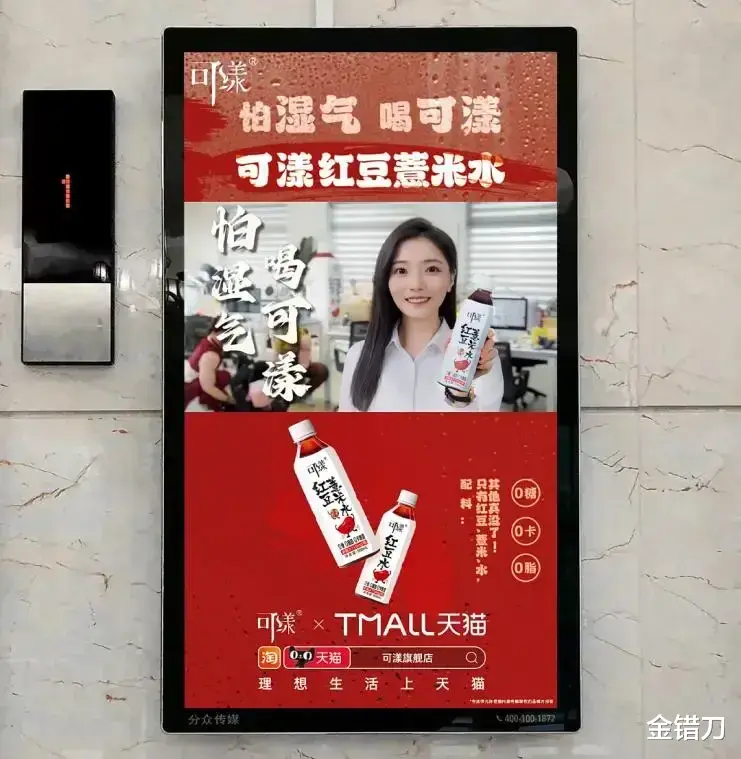 比如在电梯广告刷屏的可漾红豆薏米水,广告语非常简单粗暴:“红豆、薏米、水,其他没了!”