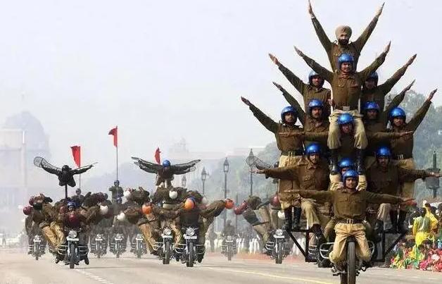 尽管中国的阅兵视频不是电脑合成,但他们的阅兵却没有印度那样有着各种高难度的摩托车叠罗汉表演。