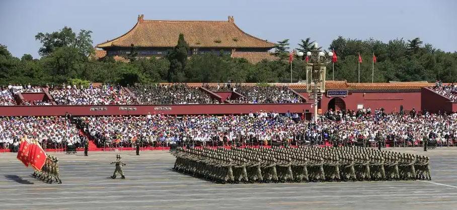 中国人民解放军的受阅部队迈着威武雄壮的步伐,由东向西分列式的通过了天安门广场,从而向世界展示了共和国子弟兵不畏强敌、保家卫国的英雄气概。