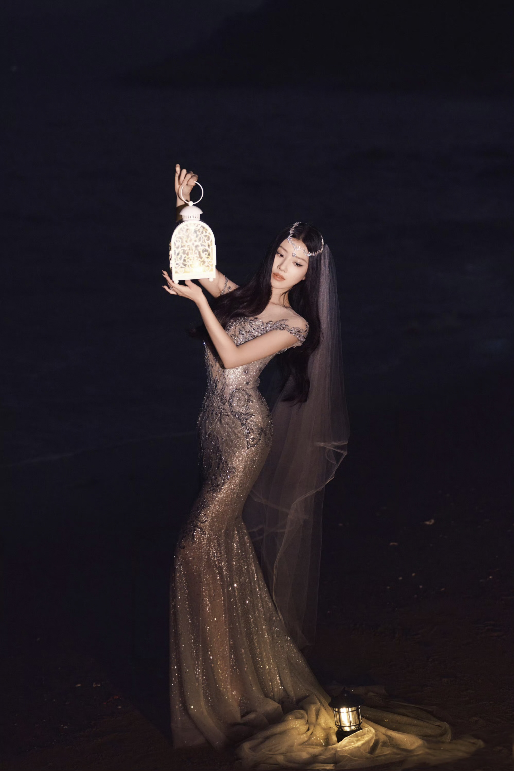 海边的夜色,是自然馈赠的浪漫留白。夜幕低垂,海面泛着细碎的粼光,晚风卷着咸湿的气息,将天空与海面晕染成一片深浅不一的蓝,静谧得能听见海浪拍岸的轻响,温柔得能接住所有的情绪。王鹤润立于海岸边,衣摆被晚风轻轻拂动,发丝随风飘散,与海浪的起伏同频,与夜色的流转共生。她的身姿纤细却挺拔,没有夸张的姿态,只是静静伫立,或是轻抬手臂,或是凝望海面,每一个动作都自然舒展,宛若从夜色中生长而出,与大海、晚风、星空融为一体。有人说她宛若幽灵般灵动,却不知这份“幽灵感”,是她褪去尘世喧嚣后的本真,是与自然相融后的轻盈——她的美,不似烈日般耀眼,而如星光般温润,不似繁花般浓烈,而如海风般绵长。海浪为她伴奏,夜色为她铺纱,她的眉眼间的清冷与海面的静谧相拥,她的身姿的轻盈与晚风的灵动共生,那一刻,人物之美与自然之境无缝衔接,分不清是夜色成就了她的美,还是她点亮了夜色的浪漫。