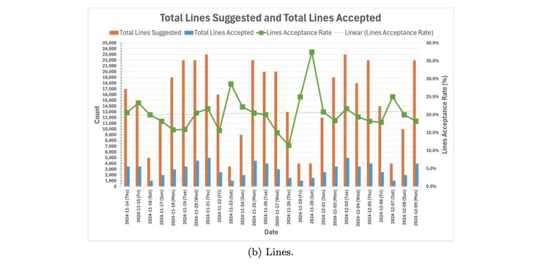 比如,基于 Zoominfo 2024 年 11-12 月的内部调研显示( 团队涉及 400 多名开发者 ),他们对 GitHub Copilot 生成的代码的平均采纳率为 20%( 按接受代码行数衡量 )。