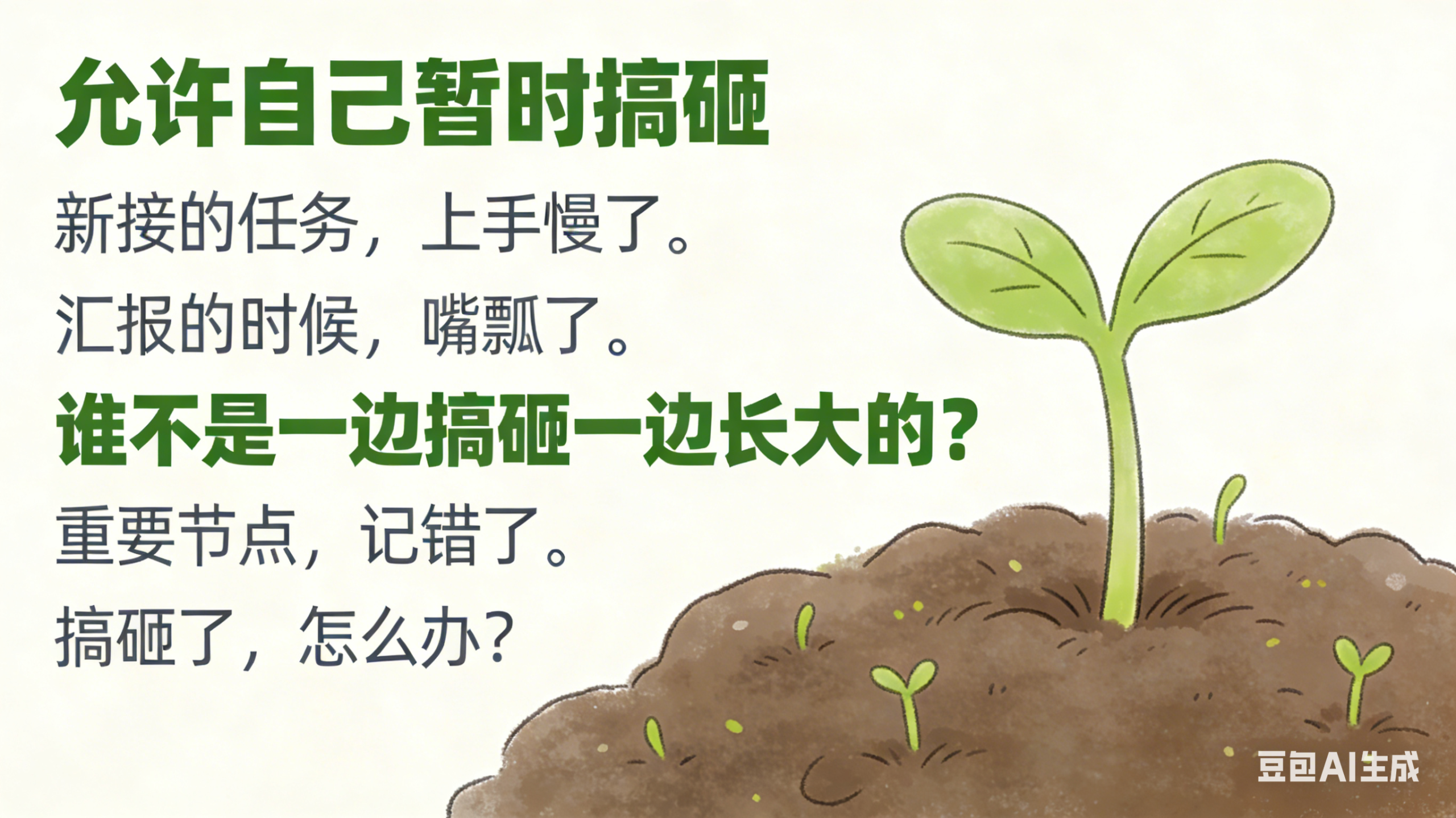新接的任务,上手慢了。汇报的时候,嘴瓢了。重要节点,记错了。搞砸了,怎么办?我见过太多人,搞砸一件事,就觉得自己整个人都完了。开会不敢发言,接任务先打退堂鼓,走路都矮三分。没必要。谁不是一边搞砸一边长大的?我刚工作那会儿,第一份独立负责的报告,数据算错了一整页。领导把我叫进办公室,我以为要挨骂。结果他说了一句话,我记了十几年:“搞砸了没事,记住怎么搞砸的,下次别犯就行。”允许自己暂时搞砸,不是放纵自己一直搞砸。是给自己一点缓冲的空间——跌倒了,爬起来,拍拍土,继续走。---