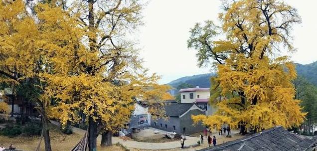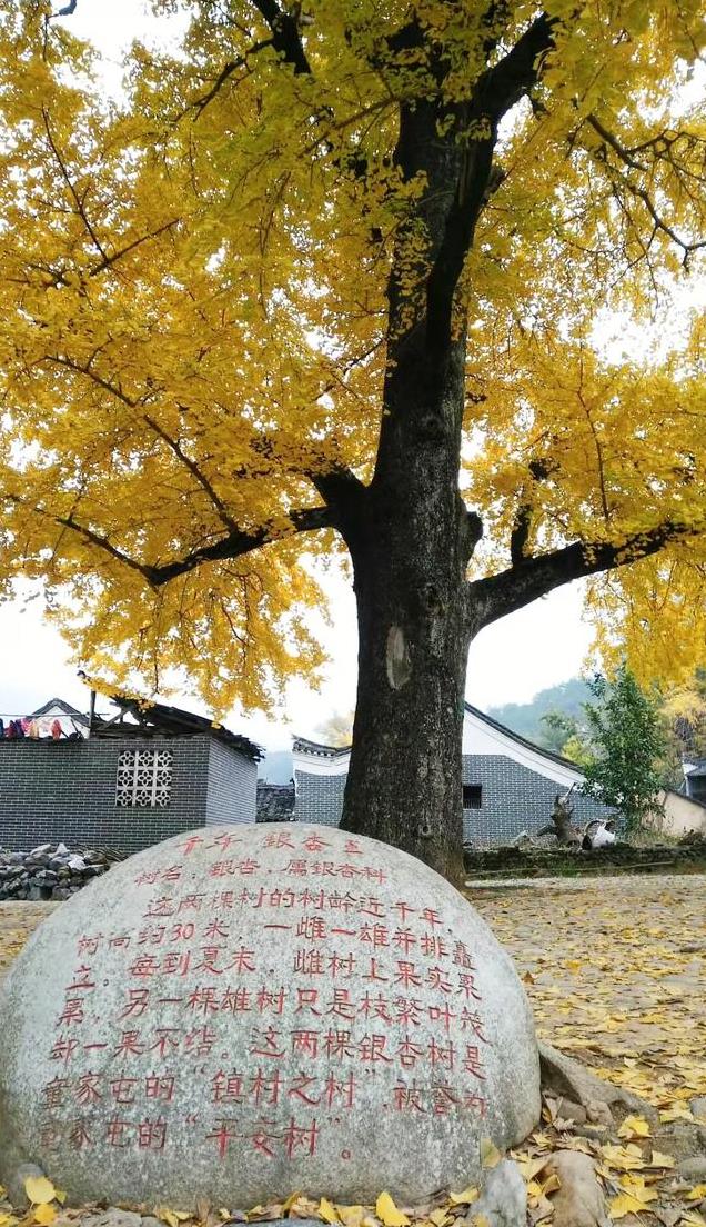 这里很多银杏树都有近千年树龄,其中有两棵树高三十多米,一棵是雌树一棵是雄树并排扎根大地,共同承担风雨。