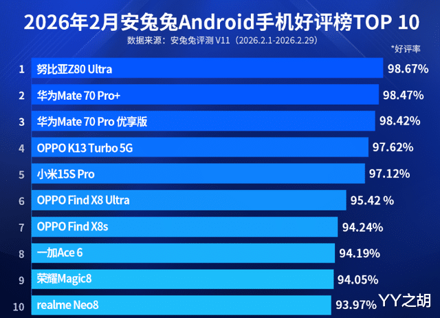 进入到2026年3月份后,国内手机评测机构安兔兔公布了2月份的安卓手机好评榜TOP10。按照介绍,好评榜数据来自安兔兔评测APP内的本机数据,是该机型用户对于自己手机的打分,和跑分无关。对于这份排行榜来说,数据收集时间为2月1日至2月28日,仅限国内智能手机市场。
