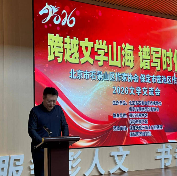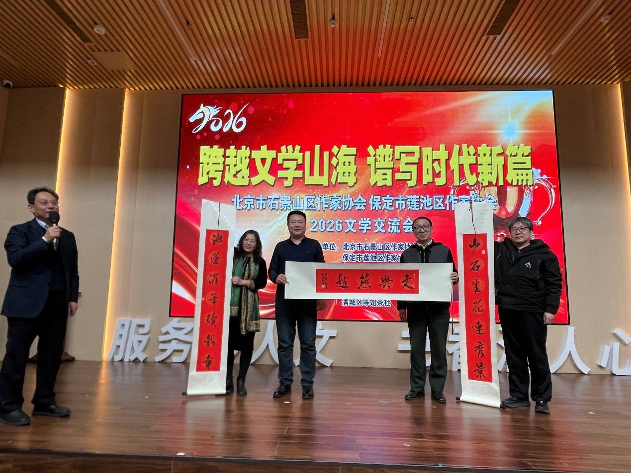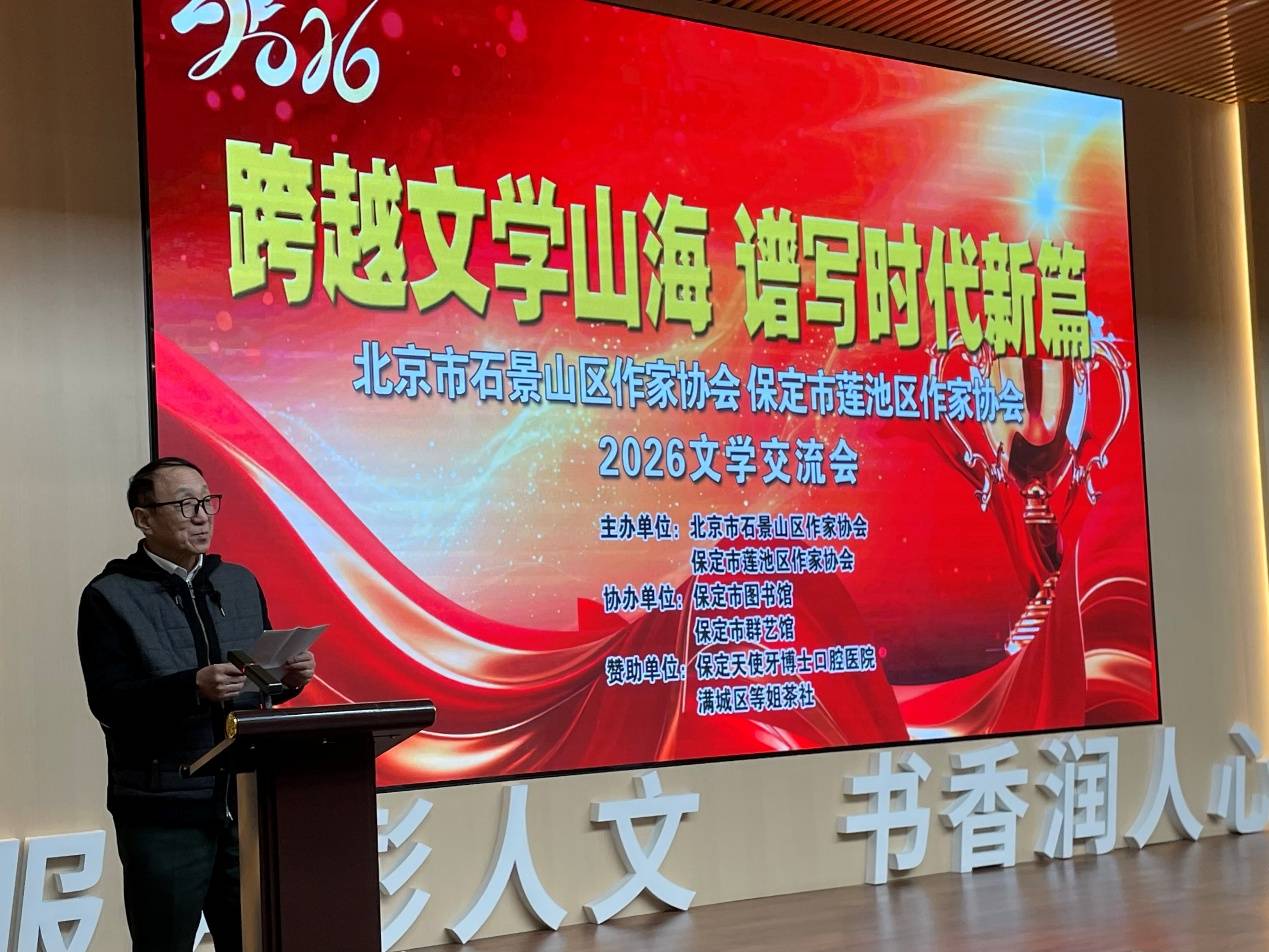 2026年1月24日,北京市石景山区作家协会12名会员应邀到保定市,与莲池区作家协会联合举办了“跨越文学山海 谱写时代新篇”2026文学交流会。北京市石景山区作家协会主席李金明,驻会副主席代志强,保定市文联二级调研员张劲鹰,保定市作家协会主席王淑彦,保定市作家协会常务副主席、莲池区作家协会主席尚未,莲池区文联主席郭艳华等出席了交流活动。两地作家、文学工作者等百余人齐聚在保定市图书馆共襄盛会。回顾了两地文学创作成果,就2026年培育健康创作生态、展望新时代大众文艺发展前景展开交流。