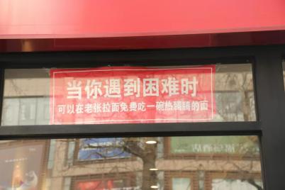 老张拉面馆店外张贴的标语上写着:“当你遇到困难时,可以在老张拉面免费吃一碗热腾腾的面。”首都文明办供图