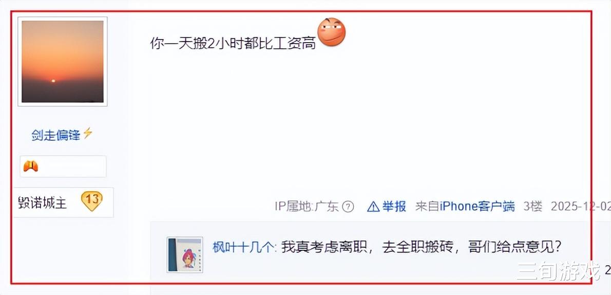 最近,来自《逆水寒》黄金服的一位玩家在社交平台发帖,称自己在游戏中打本,意外掉落了稀有装备卖了3万块,他认为游戏潜藏了巨大的商机,询问大家要不要直接提离职,当一名专职的游戏搬砖党呢?