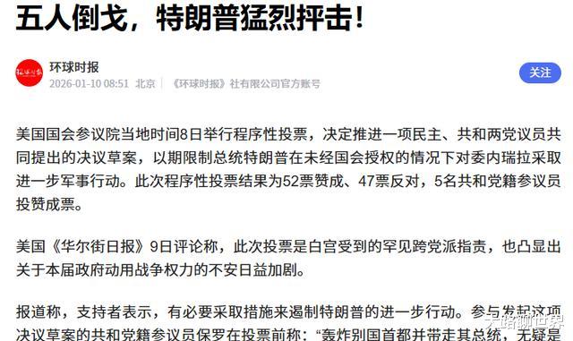 特朗普自己党里的人都开始反他了,有五个人直接投票帮着对手,就是要限制他随便发动战争的权力。这说明他已经控制不住局面了。