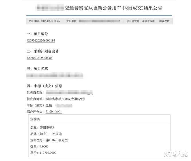 在全国多地政府的实际采购中,比亚迪已成为警车队伍中的“高频面孔”。公开的政府采购公告显示,安徽合肥、辽宁锦州、陕西西安、湖北孝感,再到贵州黔南,多地公安系统的警车采购项目中都出现了比亚迪旗下车型的身影。这些车型覆盖了秦PLUS、宋Pro、宋PLUS等多款主力产品,应用于日常巡逻、刑事侦查等多种执法执勤场景。