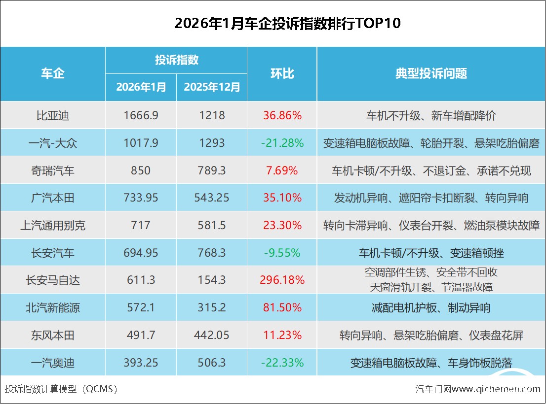 以下是2026年1月车企投诉指数的具体分析:
