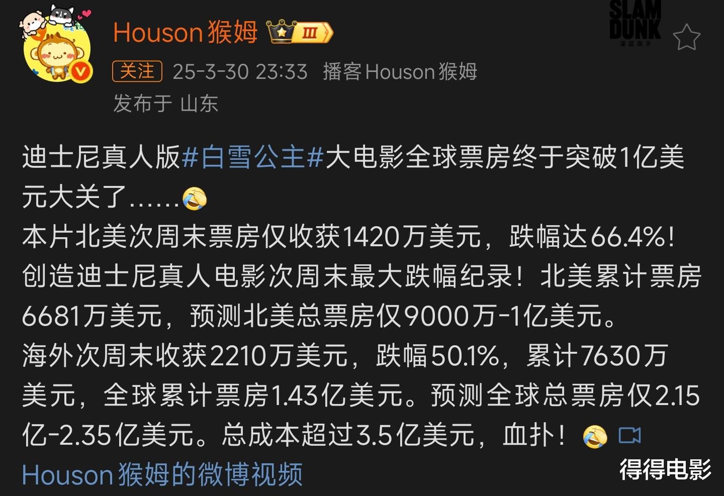 伴随着《白雪公主》的正式上映,几乎是全球同时响起了扑街的号角,北美本土首周末票房只有4300万,欧洲多国也创下迪士尼真人电影最低。