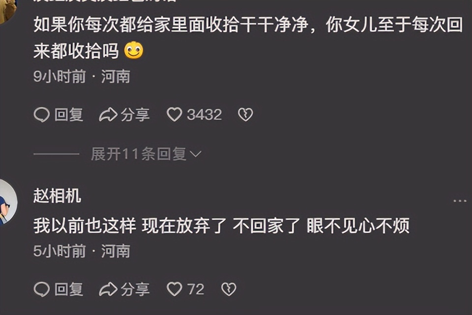 笔者这些年其实也看过很多案例,不少同学尤其是女孩子会嫌弃家里的环境越来越差,尤其是他们的家长把房间搞得一团糟,回来之后连个住的地方都没有。