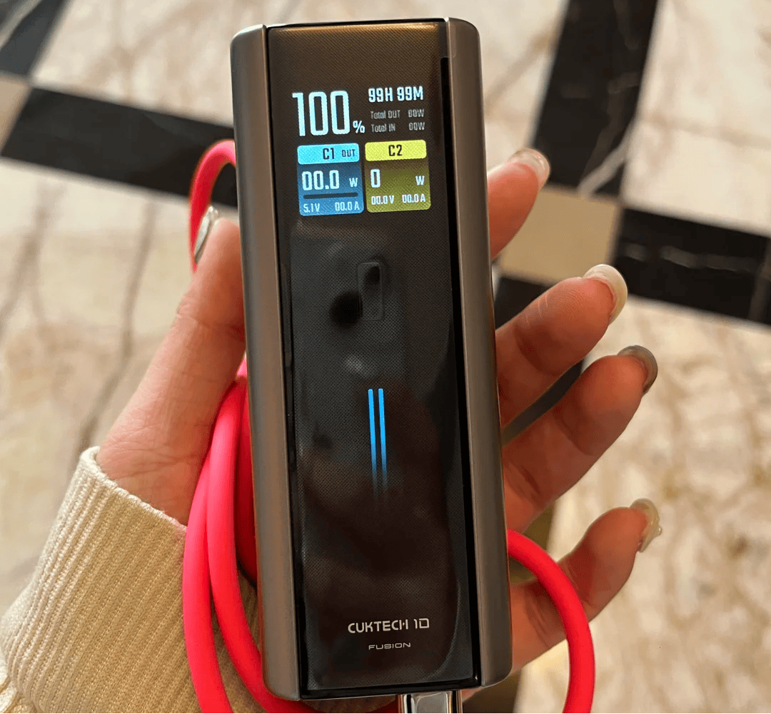 酷态科10号电能棒充电宝在设计上显得简洁而有质感,钛灰色机身低调但耐看。正面配备TFT显示屏,电量和充电状态一目了然,用起来比普通指示灯更直观。在实际使用中,它的33W快充表现稳定,给手机回血速度快,日常上下班通勤或周末短途出行两次充满基本够用。机身自带防滑处理,握持舒适,也不会在包里滑动摩擦。电池容量为10000mAh,整体重量控制得还算轻,携带相对方便。缺点是价格略高,对预算有限的用户来说可能不算最优选择,但对于追求操作体验和设计感的人来说,这个价格可以接受。