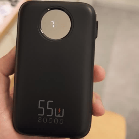 京东京造20000mAh移动电源容量充足,20000mAh电池足以支撑长时间外出使用。支持55W MAX快充,配合自带Type-C线,能快速给手机、平板回血,尤其在临时出行或赶时间时非常实用。支持多协议兼容,包括PD、PPS、华为SCP等,大多数主流设备都能稳定充电,避免了协议不匹配的尴尬。机身设计稳重结实,LCD数显屏让剩余电量随时可见,使用中清晰直观。实际使用体验中,多口同时充电效率不错,但在高功率长时间充电时会略微发热,需要注意不要覆盖物品充电。附带挂绳设计,携带更加灵活,出门短途或户外使用都方便。