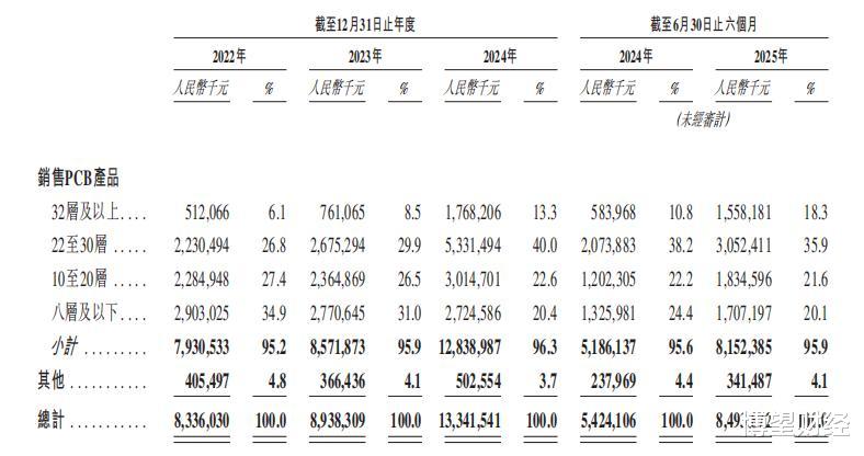 从PCB产品层数划分看,沪电股份22层至30层、32层及以上PCB产品收入占比趋高,由2022年的32.9%升至2025年上半年的54.2%;10至20层、8层及以下PCB产品收入占比则由62.3%降至41.7%。