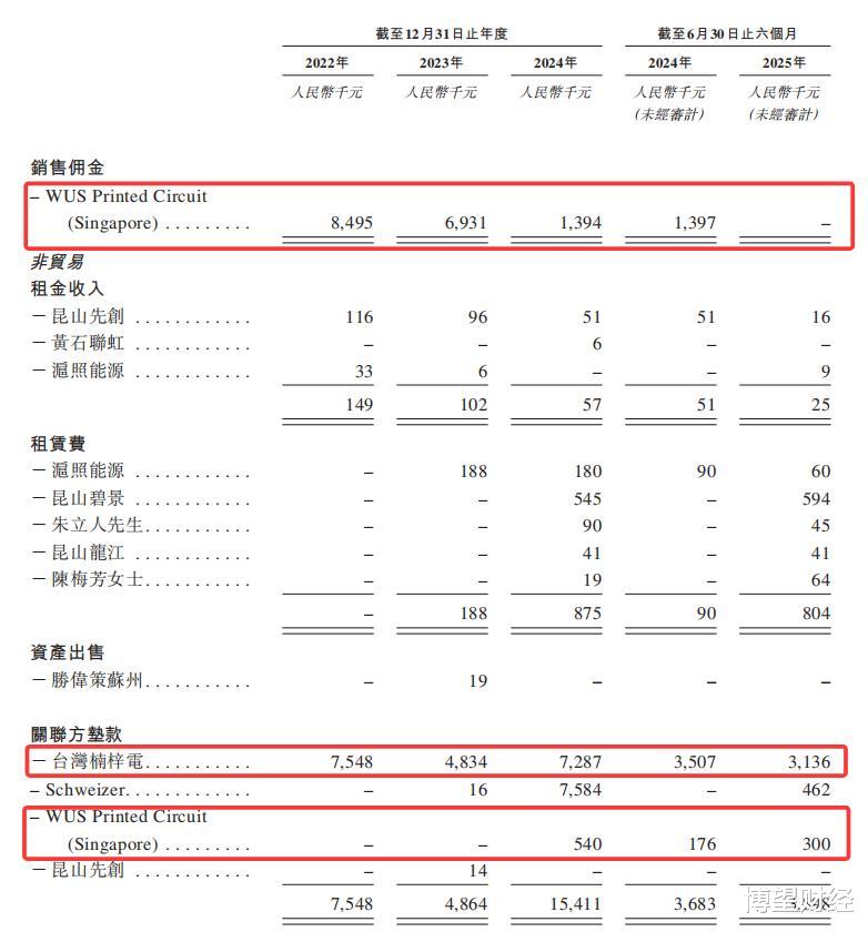 台湾楠梓电的全资子公司WUS Singapore还曾为沪电股份销售代理并收取佣金,2022年-2024年沪电股份向其支付佣金分别为849.5万元、693.1万元、139.4万元。同时,双方还存在频繁资金拆借和代垫款项,截至2024年底,沪电股份向台湾楠梓电的“关联方垫款”余额为728.7万元。