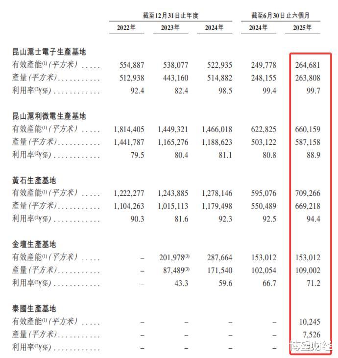 截至2025年上半年末,沪电股份在中国和泰国合计拥有五个主要生产基地。在中国的四个生产基地中,有两个位于昆山市,一个位于黄石市,一个位于常州市。从招股书披露的五大生产基地产能利用率来看,除昆山沪士电子生产基地和黄石基地的产能利用率在2025年上半年基本饱和外,其余生产基地的利用率均不及90%。