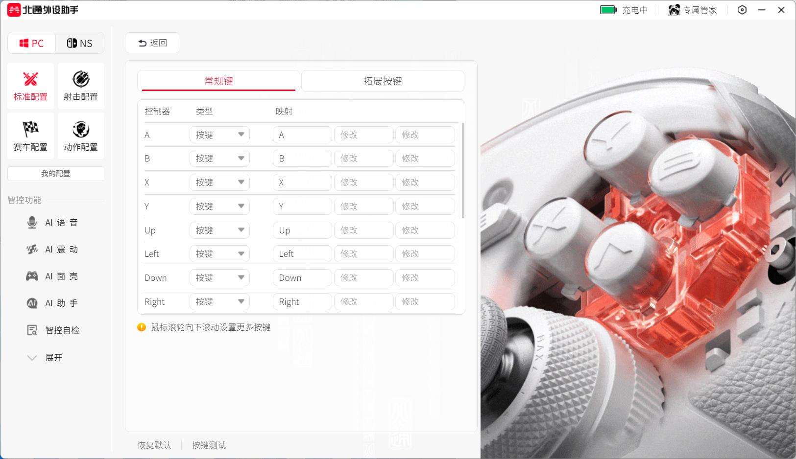 在不同使用模式下,可深度定制基础按键映射、精细调校摇杆响应曲线与多级震动强度,彻底提升操控手感。更可录制并一键执行宏命令,轻松触发复杂连招,让游玩体验如虎添翼,决胜于分秒之间。