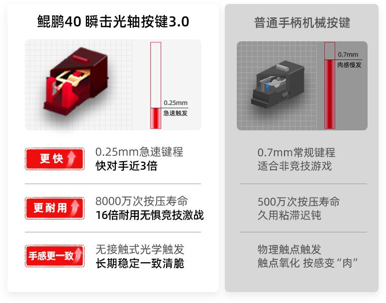 ABXY键质感非常好,搭载光轴按键3.0,压力克数60gf,键程仅0.25mm,触发迅捷、手感清脆,快普通按键3倍,寿命更高达8000万次,耐用16倍,而且做到了每颗按键手感一致。