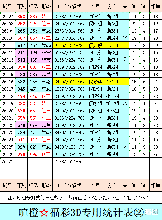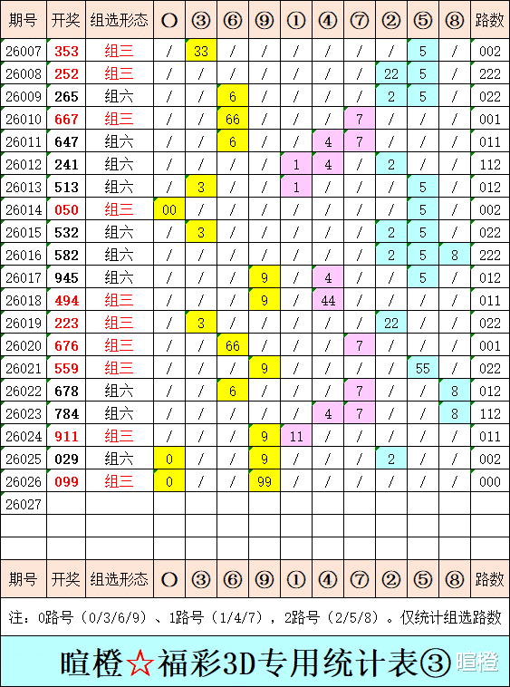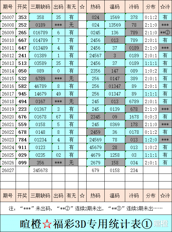 26027期:暄橙福彩3D综合条件(本期将在1月27日21:15开)一、上期回顾 ☆1、上期开奖号:0 9 9。2、和值= 18,跨度= 9。3、组三形态,000路组合。4、热度分布(热:温:冷)2:0:1。二、本期条件 ☆1、三期缺码:345678。2、热:679,温:0158,冷:234。3、断组分解式:2378//014-569。4、四胆:2678;三胆:267。三、术语解释 ☆1、三期缺码:0至9这十个自然数当中,未在近三期开奖号出现的数字。2、热度(热温冷):自然数0至9,在近七期开奖号中,出现3次及3次以上的数字,称为热码;出现2次的数字,称为温码;出现1次和未出现的数字,称为冷码。某个数字在开奖号中出现几个,就按几次计算。3、断组分解式:将0至9这十个自然数,分成三组数字,从前往后依次为A组(4码)、B组(3码)、C组(3码),一般情况下,有一组数字不出码,偶尔会有两组数字不出码。A组不出码的情况相对较少。断组为主,分解为辅。4、常态组六号码:同时包含大数、小数、奇数、偶数、质数、合数的组六号码,共有72注。统计表中,简称“常态”。5、非常态组六号码:全大数、全小数、全奇数、全偶数、全质数、全合数等六种形态的组六号码,共有48注。统计表中,简称“非常”。★提醒:彩市有风险,参与须谨慎!水平有限,仅供参考!