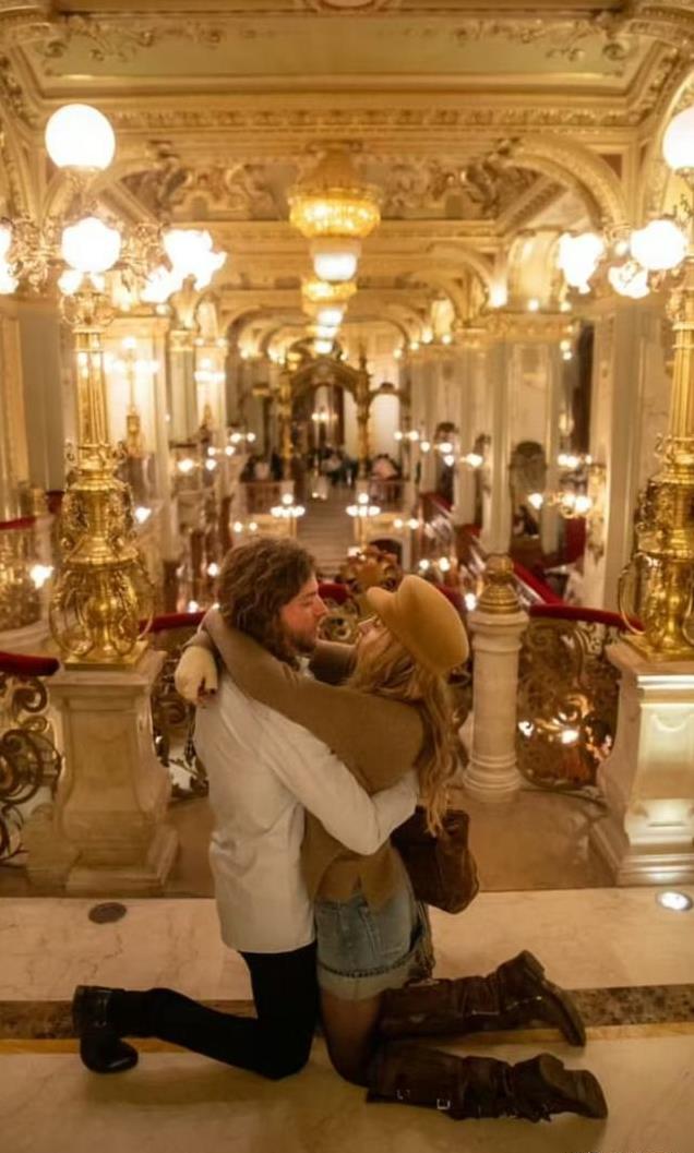 两人拥吻,有一张男友单膝下跪,帕丽斯站着弯下腰亲吻他的照片,简直太浪漫了!