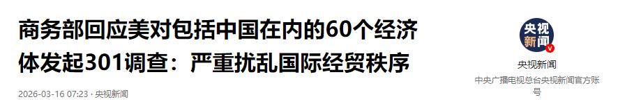 参考信息2:《商务部回应美对包括中国在内的60个经济体发起301调查:严重扰乱国际经贸秩序》央视新闻2026.03.16