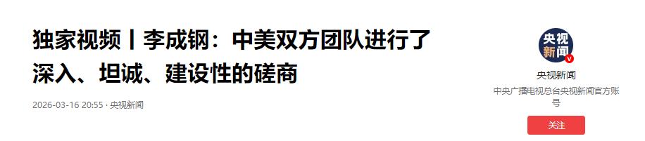 参考信息1:《独家视频丨李成钢:中美双方团队进行了深入、坦诚、建设性的磋商》央视新闻2026.03.16