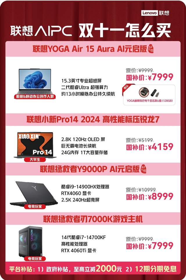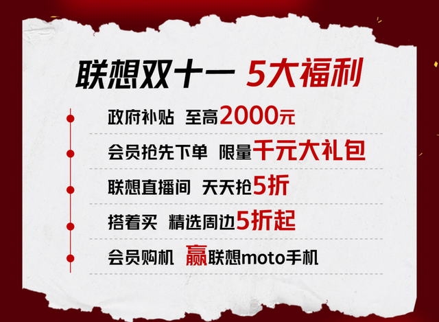 好产品配好福利才算双十一狂欢。这次双十一联想带来了五大王炸级优惠、极致的产品品质和诚意满满的促销优惠,回馈本次双十一消费者,掀起新一年双十一购物狂欢热潮。首先,国补补贴至高2000元,用买普通电脑的钱就可以购入一台新款AI PC!只要你是联想会员,不仅可以抢先下单心仪产品,还有机会获得限量千元大礼包和联想moto手机。