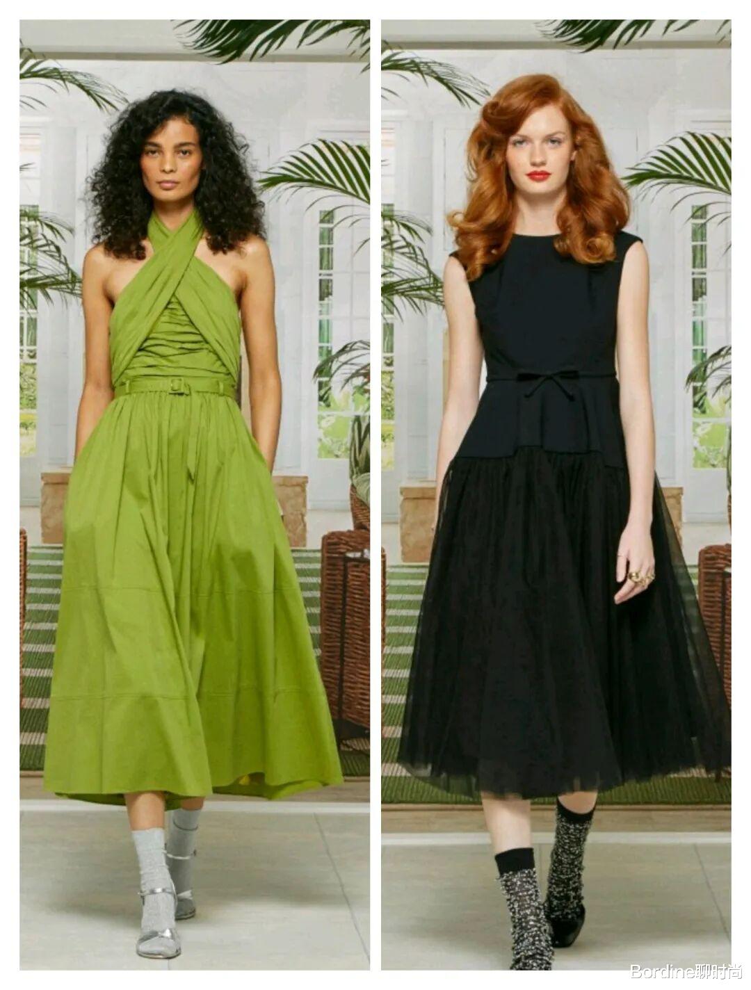 鲜艳的橙色颜色在这些色彩的氛围中,还在纯色的简约大方中,这些鲜艳色彩在热情的气质中,暖色调的颜色更多了温暖的能量感,纯色的简约还多了裙装的优雅气质,在不对称的打结系带、不规则下摆、拼接的鱼尾下摆、棕色皮带等这些服装之间的结合,也让橙色裙装也多了一些细节的设计潮范儿。