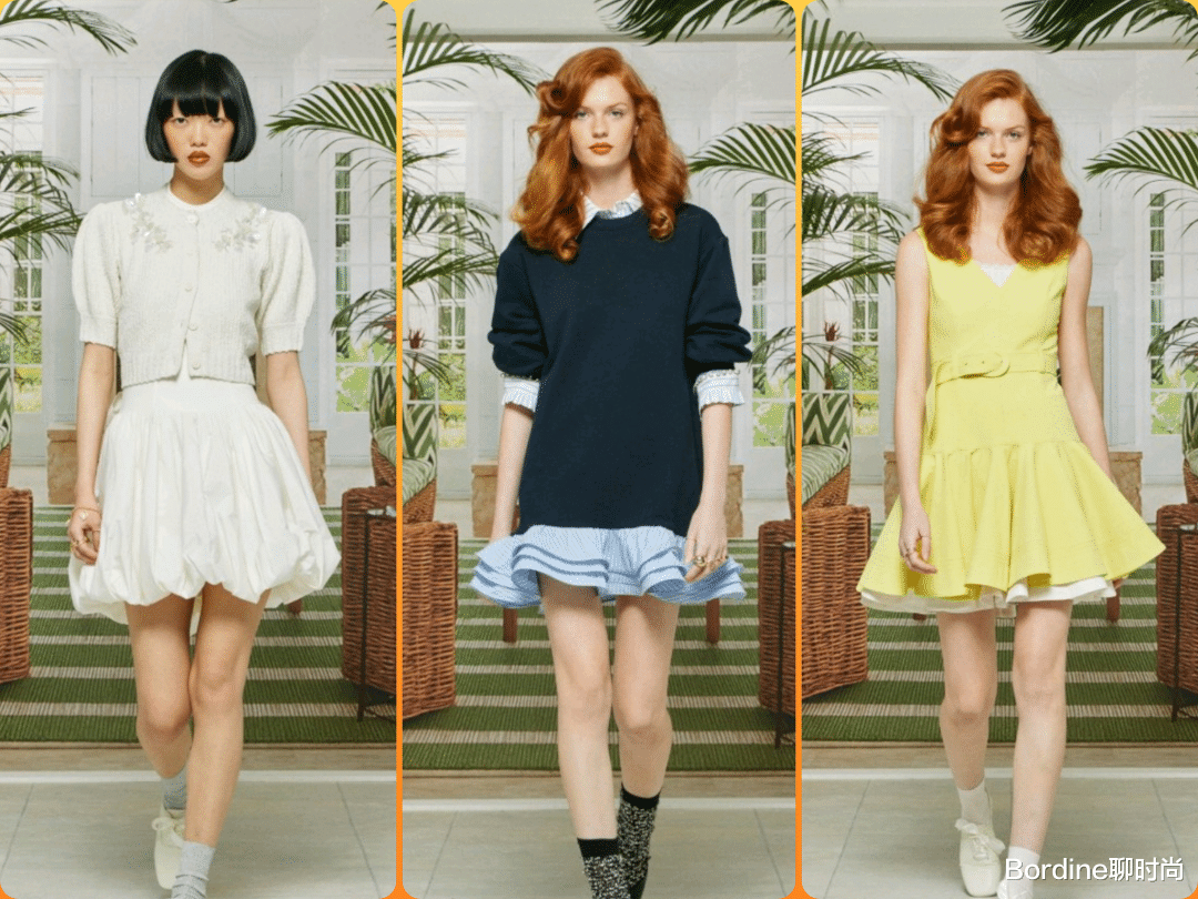 荧光黄色的颜色在鲜艳的色调上,也有一些清新的青春能量感,纯色的简约还多了裙装的优雅温婉气质,在腰间的位置,也在打结系带的露腰、棕色皮带的收束装饰等设计,为这些黄色的裙装也将视线集中在领口的位置。