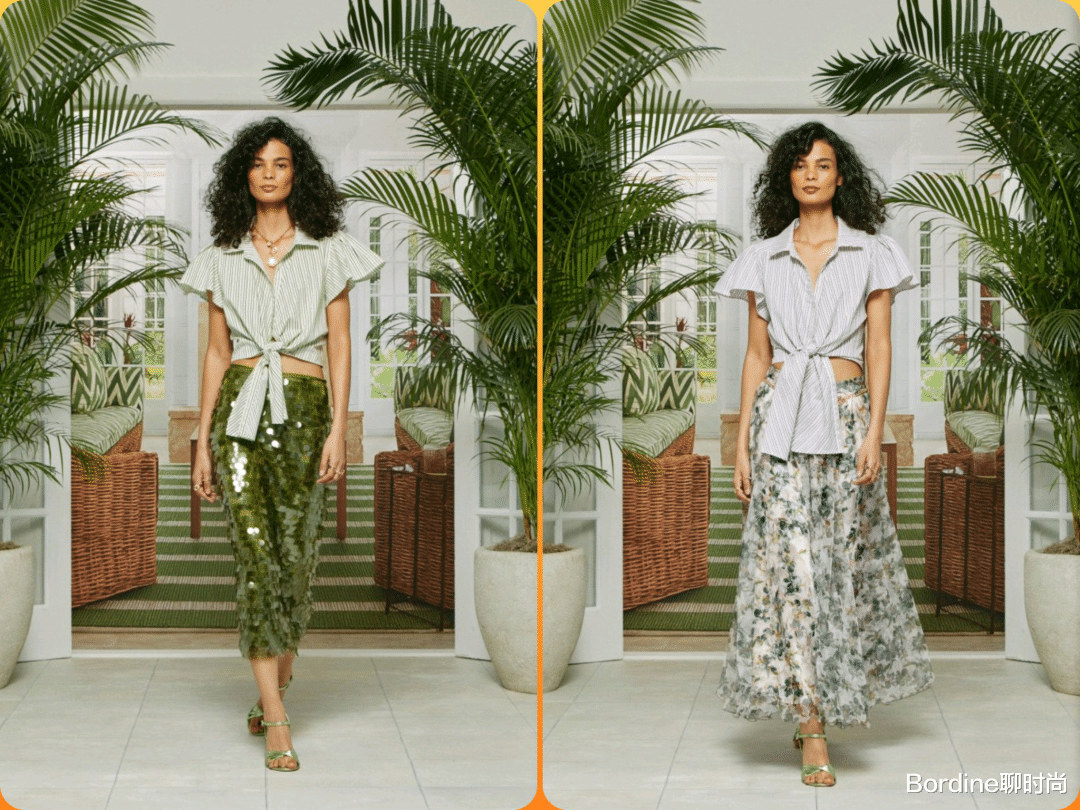 短袖的上衣在衬衫元素中,V字衣领修饰了脖颈线条,还在喇叭袖的造型多了廓形线条的细节感,而衬衫上衣的服装在打结系带中也拉高了腰线,增加了小蛮腰的魅力,让上衣的位置有着更多的设计感;这些条纹的设计感上衣和半身裙进行搭配,亮片增加了光泽感,轻薄花纹更有轻盈活力感。