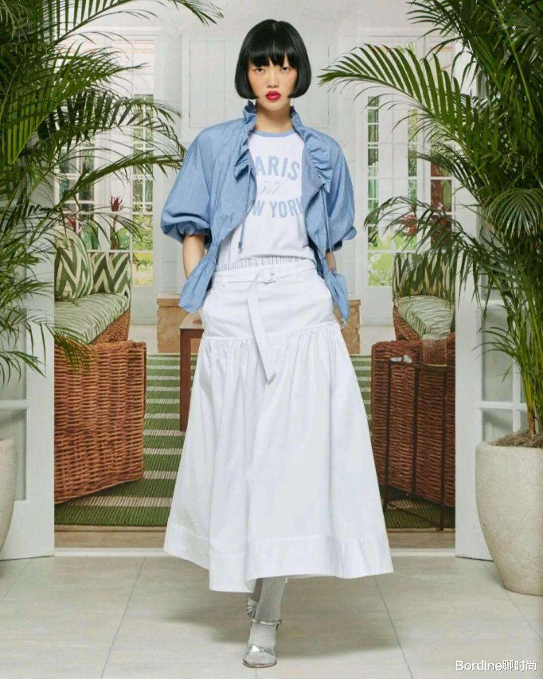 在膝盖之上的裙装露出了不少腿部的线条,裙装在宽松的廓形中增加了直线的线条感,还在短袖的款式在喇叭袖的造型增加了一些廓形线条,而下摆对比的层次、撞色花纹等设计,则让服装有着不少细节和活力的气质。