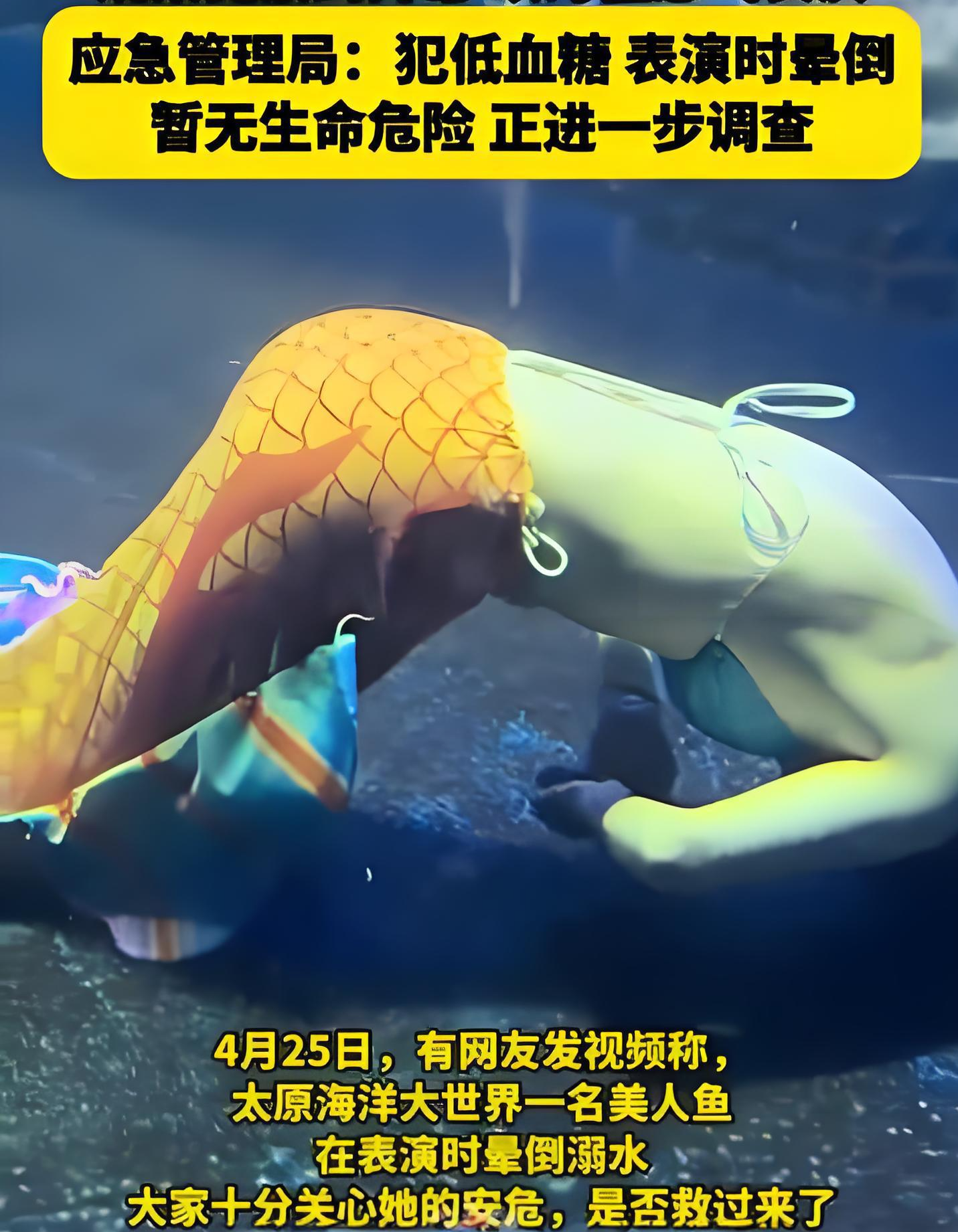 4月25日,太原海洋大世界一名“美人鱼”表演者在水中突然晕厥,引发游客和网友广泛关注。现场视频显示,表演者失去意识漂浮在水中,未佩戴氧气设备,游客察觉异常后迅速通知工作人员施救。当晚,当地官方及场馆方回应称,事件系表演者低血糖发作导致,经及时送医救治,目前无生命危险。