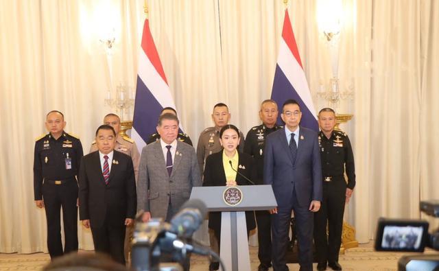 会晤结束后,佩通坦携副总理兼国防部长普坦、泰国军队最高司令颂威、泰国陆军总司令帕纳上将等军方领导人,就她与柬埔寨前首相洪森的通话录音泄露事件举行新闻发布会。