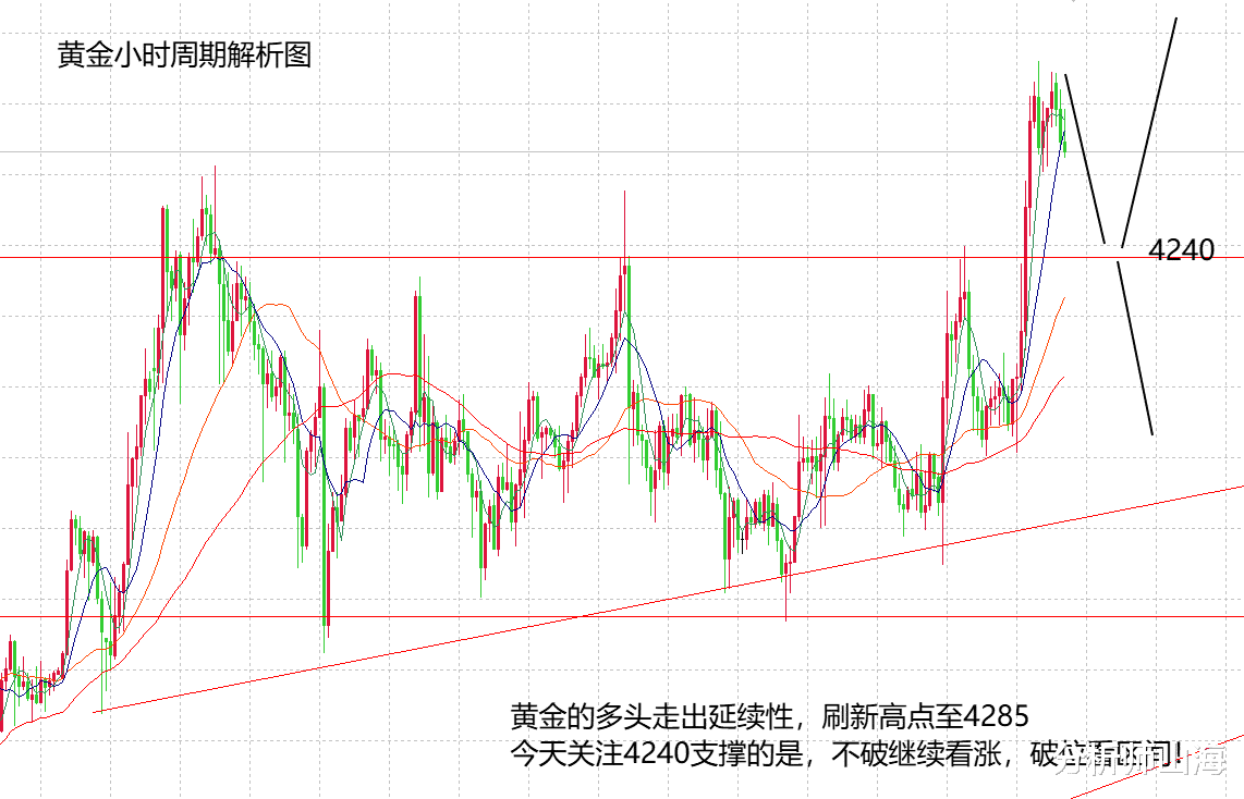 周四强调黄金保持多头趋势不变,但不一定是极强走势,盘中看准了黄金在回落中跌破4220后,有可能去4200的力度,但没有看出午夜盘持续走高的力度,最大力度上涨至4285,相当于这波破位4260的预测高点,多出了25美金,不要小看这25美金,有可能这25美金就是这个周期黄金走出极强单边行情的基础。按照现在的走势来看,黄金在周五可能继续走高,上方关注4300,4350。技术面内,周四最大的变化是H4周期的表现,日线上涨走势不变,只是从前期的小阳变大阳,证明了多头的放量增大,上轨的高点在4300,继续走高可以看到4350,4385,日线还在持续放量中,而随着这波上涨的力度走出来,H4周期布林上轨开口,形成单边均线的上涨走势,所以,看似上涨的力度不大,实则是H4形成了极强的单边,那么,交易的话围绕H4单边均线的支撑继续做多看涨。日内关注两个点一个是4250,一个是4232,如果亚欧盘回落不破4250,那么按照强势继续做多看涨,再看4300,如果亚欧盘跌破4250,下方还有4232可以继续做多,再看4285,当然,今天周五,周一到周三是震荡走势,周四出现突破性上涨,周五也有可能是获利回吐的下跌,跌破4232就要否掉极强单边的走势。