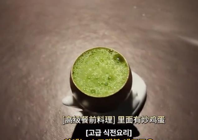 菜品很快就被呈上来了,第一个被端上来的是一半“大金蛋”,金色的蛋壳中是满满的绿色汤汁。