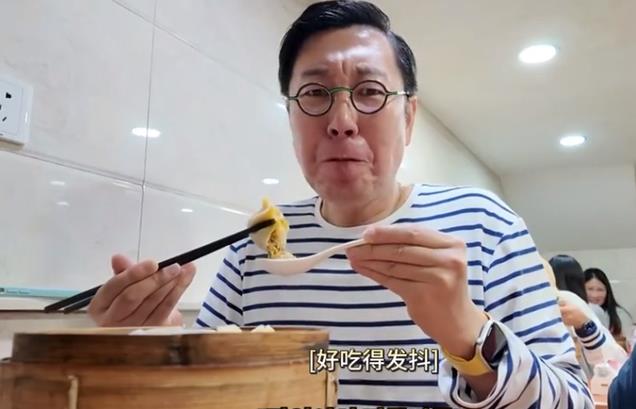 吃了几个馄饨之后,蟹肉小笼包也被端了上来,他拿起手机给小笼包来了个特写照,接着就开始品尝,这一口下去包子直接“露馅了”。