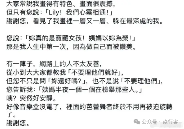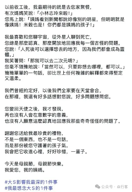 小S的二女儿发文回忆大S,字里行间满是对“姨妈”的眷恋。在她的笔下,大S是那个能看穿她纯真内心、会在深夜为她抵挡网络恶意的温暖存在。这份情感,源自生活中点点滴滴的相处,是真实而动人的。她对大S的回忆,让我们看到了在聚光灯之外,大S作为亲人的温柔一面。