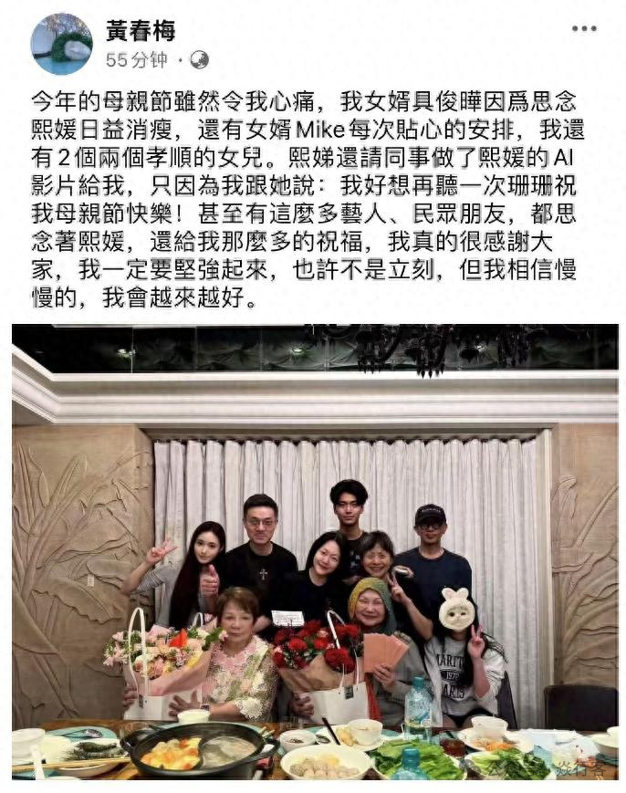 大S的母亲晒出了一张家庭照。照片里,一家人曾经的笑容灿烂而真挚,可如今,却永远少了那个熟悉的身影。这张照片,承载着的是母亲对女儿深深的思念,每一个细节都可能勾起她对往昔的回忆。作为母亲,这么优秀的女儿先自己而离去,白发人送黑发人,应该是特别特别伤痛的。晒出照片,也许是她纪念女儿的方式,是在这个特殊的日子里,对女儿的一种无声诉说。只是这份思念,也难免会被外界赋予各种解读。毕竟S家关遗产的纠纷,众说纷纭,而且具俊晔在合照里,但大S的两个孩子却没有出现,也让人费解。