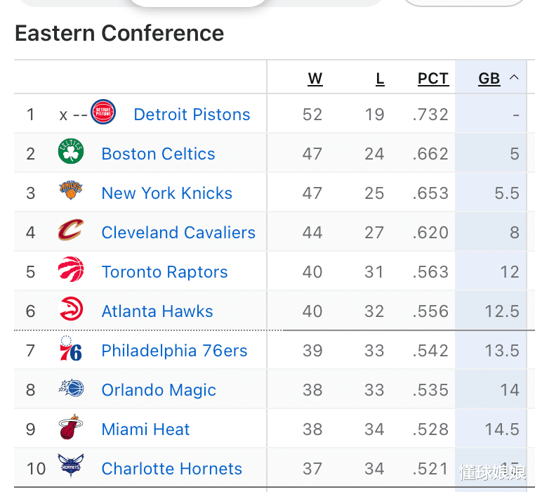 76人和东部第10的黄蜂只领先了1.5个胜场差。