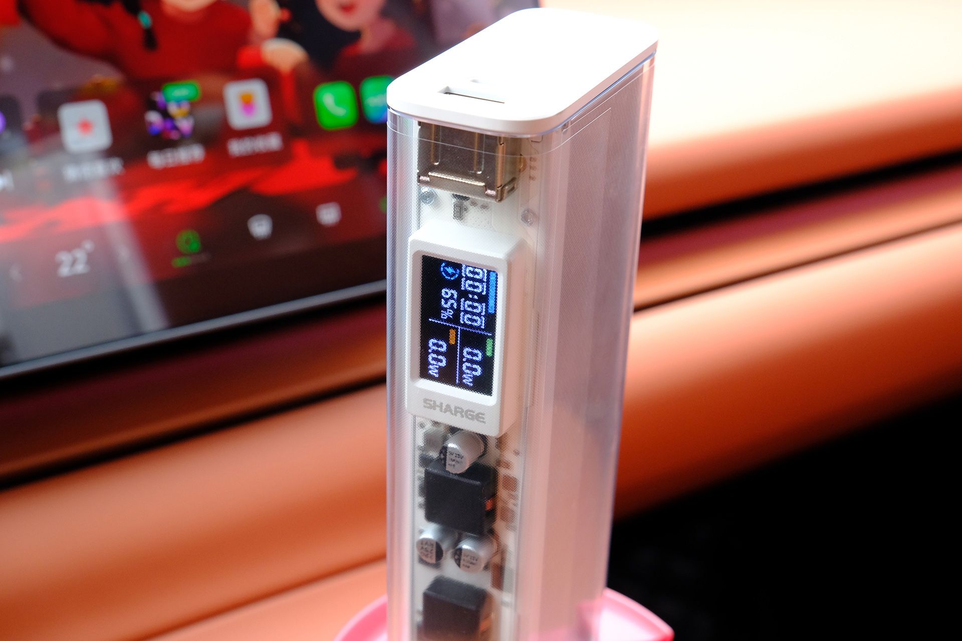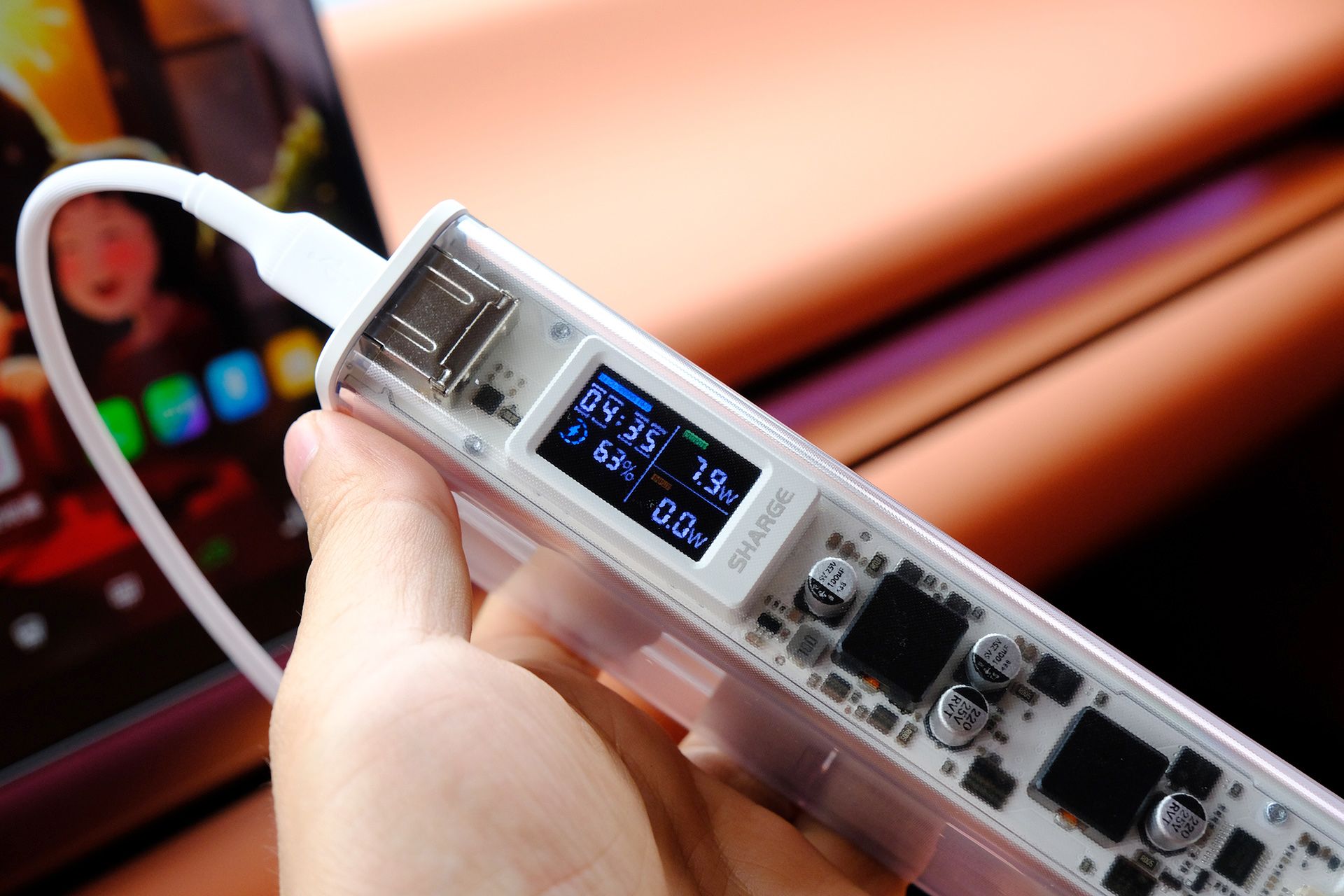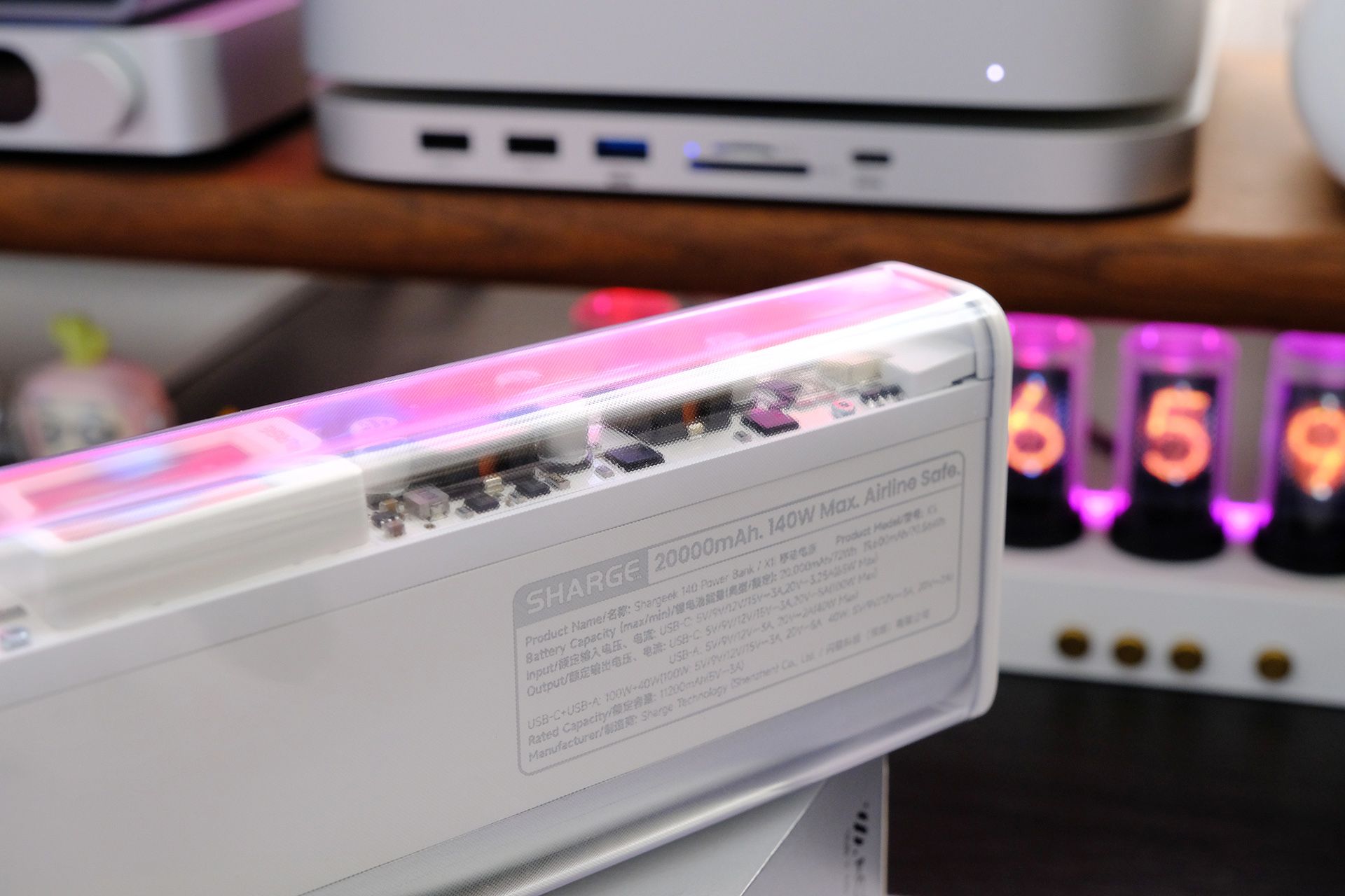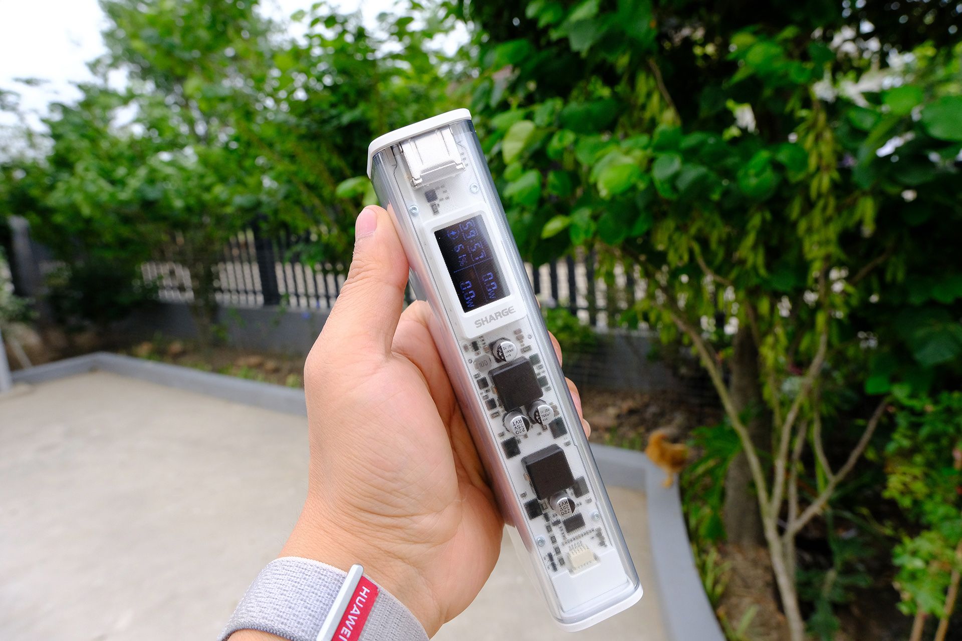 最吸引人的当属它的透明外壳设计,外面一层透明亚克力包裹,内部工字型的中框结构将其分割成上下两部分。上半部分完全透明外露的白色一体化电路板,能清晰看到内部用料扎实,电子元器件排布规整合理,满满的科技感扑面而来,这种独特的设计使其从众多移动电源中脱颖而出,即便是放在桌面上,也宛如一件精致的科技摆件,为桌搭增添了不少亮点。